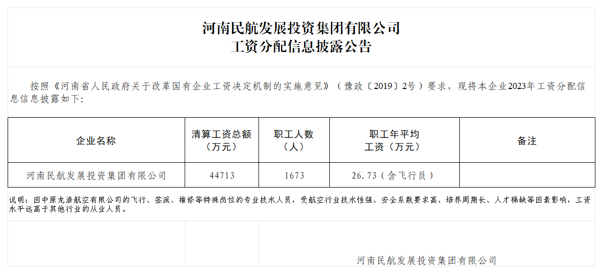 河南民航發(fā)展投資集團有限公司2023年度工資分配信息披露