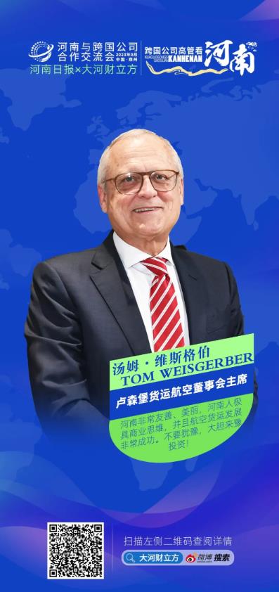 9月5日,盧森堡貨航董事會主席湯姆·維斯格伯前來鄭州參加河南和跨國公司交流合作會,同行的還有盧森堡貨航總裁兼首席執(zhí)行官理查德·福森,兩位負(fù)責(zé)人聯(lián)袂遠(yuǎn)道而來,足見他們對河南的重視。