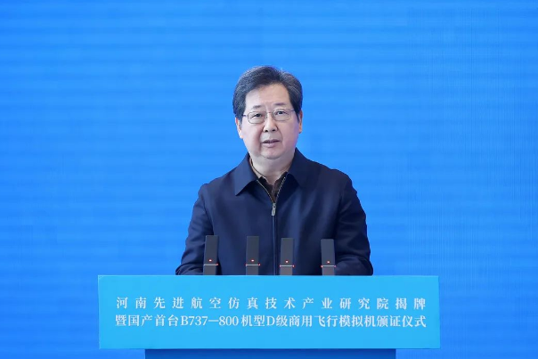 11月26日,河南先進(jìn)航空仿真技術(shù)產(chǎn)業(yè)研究院揭牌暨國產(chǎn)首臺B737-800機(jī)型D級商用飛行模擬機(jī)頒證儀式在航空港區(qū)舉行。省委書記樓陽生出席并講話。