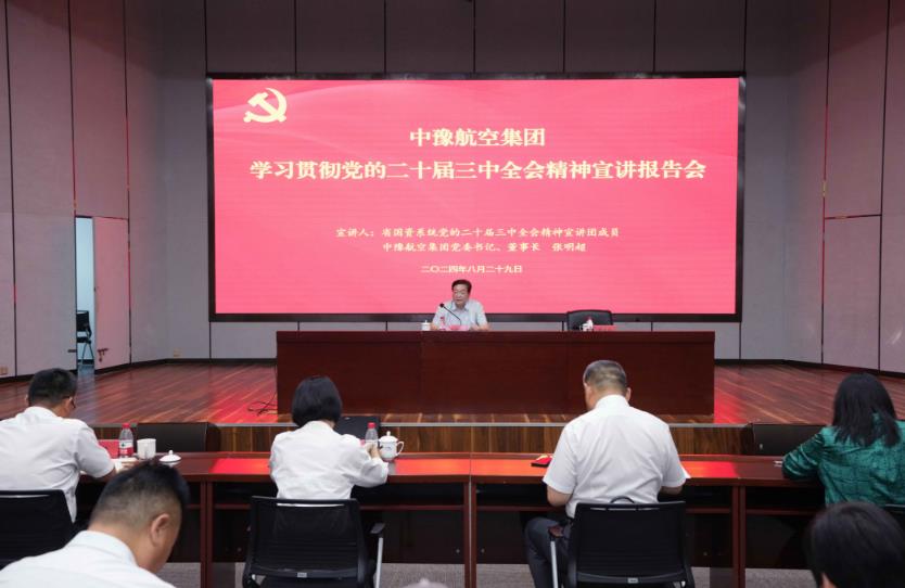 8月29日,按照省委和省政府國資委黨委部署,中豫航空集團舉行學習貫徹黨的二十屆三中全會精神宣講報告會。省國資系統宣講團成員,中豫航空集團黨委書記、董事長張明超作宣講報告,黨委副書記、總經理、副董事長柳建民主持會議,集團領導班子在鄭成員、中層管理人員、青年員工代表約300人參會。