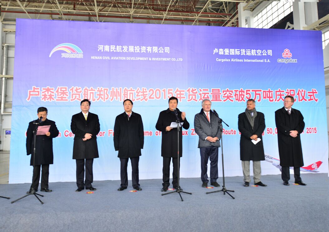 趙建才在致辭中指出:今年以來,河南航投與盧貨航圍繞“雙樞紐”發展戰略,充分發揮各自優勢,努力搶抓國家“一帶一路”戰略機遇,推動了盧森堡貨航先進技術和管理經驗在實驗區的再造,帶動和促進了雙方區域經濟的協同發展和交流。開通了盧森堡至鄭州至芝加哥、鄭州至米蘭等洲際貨運航線,構建了以鄭州為中心,“一點連三洲,一線串歐美”的航空國際貨運版圖,在不到一年的時間里,航班加密至每周13班,年度貨運量突破5萬噸,為新鄭國際機場貨運量的快速提升做出了突出貢獻!這一可喜成績的取得,是盧森堡貨航與河南航投優勢互補、協調發展、合作共贏的成功典范,是我們推動國家“一帶一路”發展戰略的生動實踐。希望盧貨航與河南航投搶抓實驗區戰略機遇,深入推進“雙樞紐”戰略實施,不斷豐富合作內容,加快推動以鄭州為樞紐的合資貨航、飛機維修基地、卡車航班的設立,積極培育河南參與國際分工與合作的新優勢,促進河南與盧森堡乃至歐亞之間的經貿、文化、旅游等全方位的交流合作!