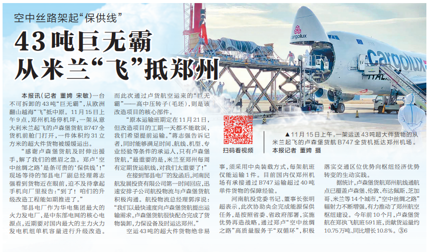 “感謝盧森堡貨航及時伸出援手,解了我們的燃眉之急。鄭盧‘空中絲綢之路’是條可貴的‘保供線’!”現場等待的鄒縣電廠副總經理蔣志強看到貨物近在眼前,迫不及待拿起手機向廠里報告:“到了!咱們的升級改造工程能如期推進了。”