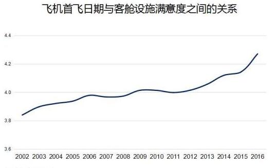 上圖是飛機首飛日期與客艙設施滿意度之間的關系,可以看出首飛日期越近滿意度越高,首飛日期越早滿意度越低,而且是持續地降低。“也就是說我們人的需求在變化,我們得跟上人的需求變化。行業的標準是持續的在升級的,我們需要往前追趕。”