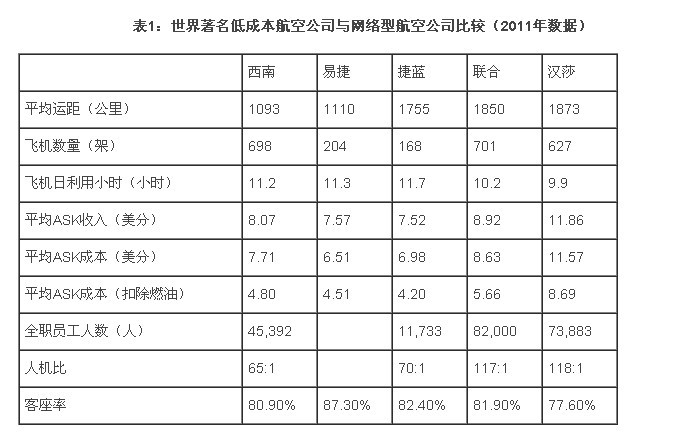 為了便于比較,本文選擇了我們普遍認可的低成本航空公司與較為熟悉的網絡型航空公司2011年的報表數據,分別從平均運距、機隊規(guī)模、飛機日利用率、平均ASK收入與成本、以及客座率與人機比等項目進行比較(如表1)。